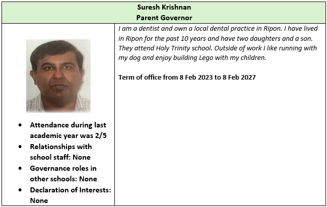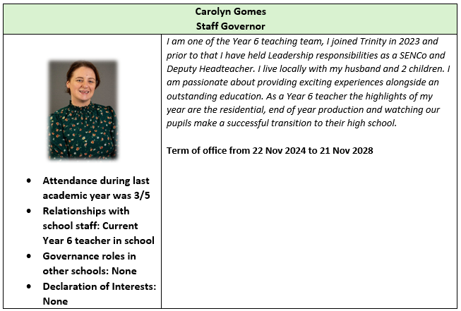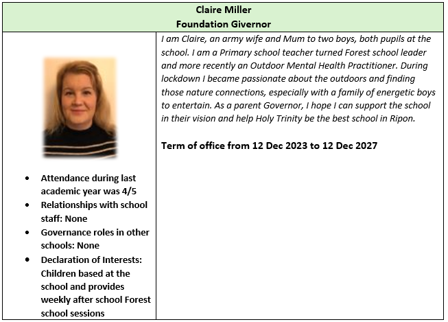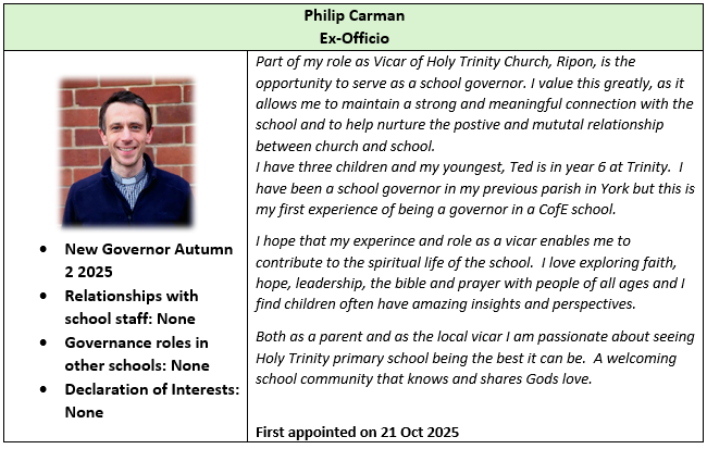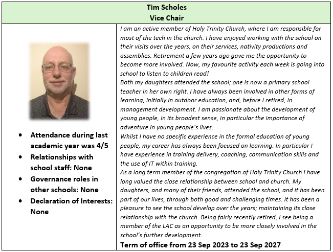 The Local Academy Council (LAC), through a scheme of delegation, has local responsibility for the governance and oversight of the Academy. The LAC at Holy Trinity Church of England Primary School comprises a Foundation Governor, the vicar at Holy Trinity Church, elected parent governors and a staff representative. The LAC can also co-opt governors. The LAC has responsibility for setting the school vision and ethos; the strategic plan for the academy; the curriculum and staffing structure; and managing the budget at a local level, working with the Trust’s Chief Finance Officer.