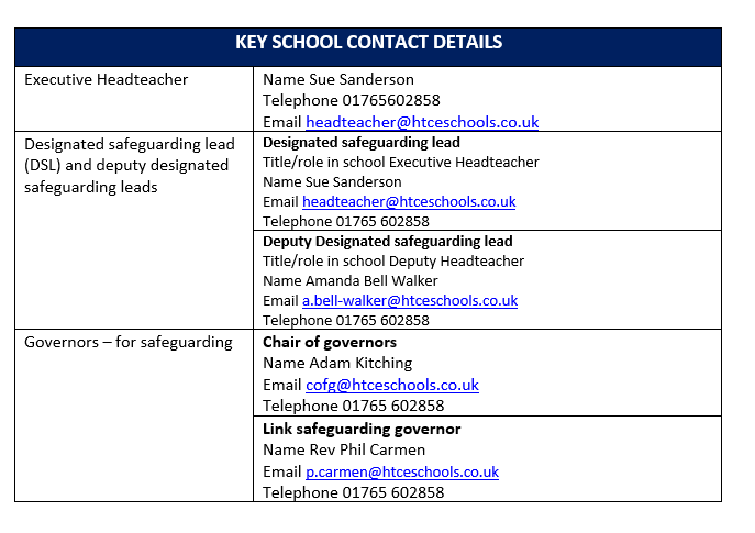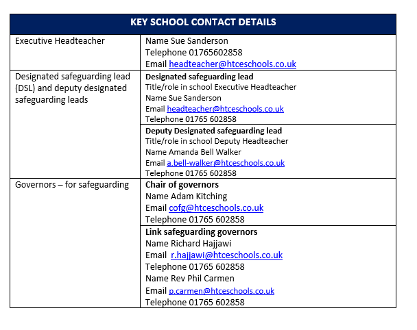 Holy Trinity Church of England Primary School adheres to all North Yorkshire Safeguarding Children's Board procedures. The school will, in most circumstances, endeavour to discuss all concerns with parents about their child. However, there may be exceptional circumstances when the school will discuss concerns with Social Care and/or the police without parental knowledge (in accordance with Child Protection procedures). The schools will, of course, always aim to maintain a positive relationship with all parents.