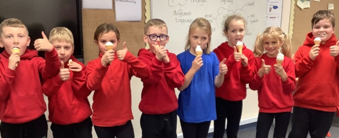 Thursday was especially exciting as it was Michael Rosen day. We spent the day reading, listening to and writing our own poetry. We created riddles in poem form and challenged our friends to guess the food we were describing. The day got even more exciting with a visit from the ice cream van! As you can see from the photo, we really enjoyed them! George Mc said "Mine was really delicious," and Tessa said "I wish we had it every day!"