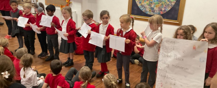 In culmination of our great day, we came together for a celebratory assembly of the poetry we had written throughout the day. It was wonderful listening to children from Reception to Y6 read, perform and share their hard work. It was very clear that lots of fun had been had throughout the day! Reception wrote and performed a rhyme, Y1 and Y2 wrote and delivered acrostic poems, Y3 wrote food-related riddles (some really puzzled us), Y4 wrote great continuous poems which went from one child to the next, Y5's poems made us hungry and Y6 stood as a collective and performed an adapted version of 'We're Going on a Bear Hunt' with a food twist called 'We're Going on a Food Hunt' which we all loved and joined in with!