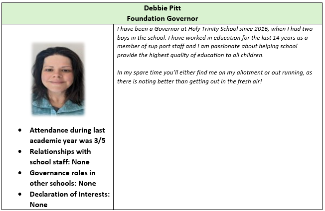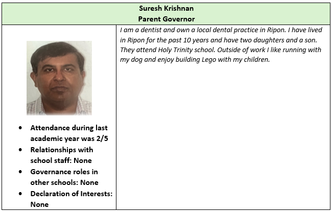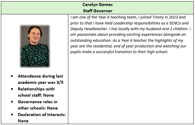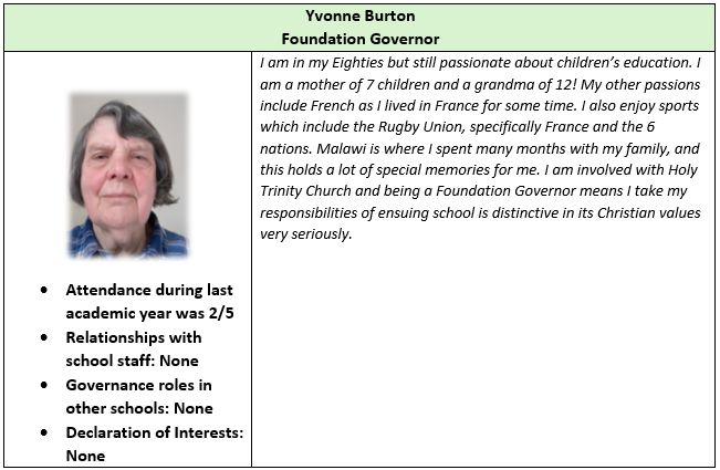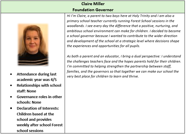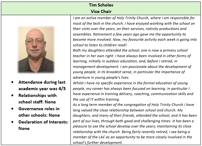 The Local Academy Council (LAC), through a scheme of delegation, has local responsibility for the governance and oversight of the Academy. The LAC at Holy Trinity Church of England Primary School comprises a Foundation Governor, the vicar at Holy Trinity Church, elected parent governors and a staff representative. The LAC can also co-opt governors. The LAC has responsibility for setting the school vision and ethos; the strategic plan for the academy; the curriculum and staffing structure; and managing the budget at a local level, working with the Trust’s Chief Finance Officer.